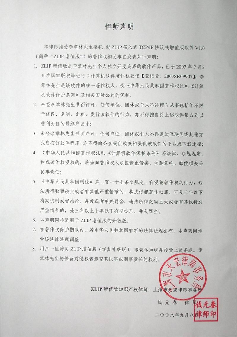 上海卓嵐信息科技有限公司聘請(qǐng)上海天宏律師事務(wù)所(http://www.tianhlaw.com/index.asp)的錢(qián)元春律師作為ZLIP增值版知識(shí)產(chǎn)權(quán)律師。上海天宏律師事務(wù)所是一家專業(yè)提供知識(shí)產(chǎn)權(quán)法律服務(wù)的律師事務(wù)所,處理過(guò)多起國(guó)內(nèi)、國(guó)際知識(shí)產(chǎn)權(quán)糾紛案。