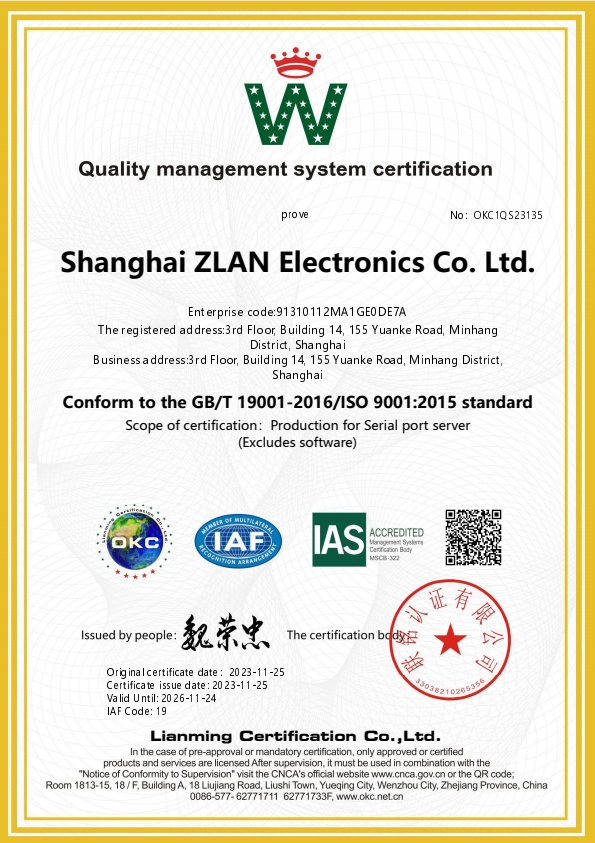 上海卓嵐信息科技有限公司是一家專業(yè)提供工業(yè)物聯(lián)網(wǎng)解決方案,集研發(fā)、生產(chǎn)、銷售為一體的集團公司。成立于2008年,注冊商標“ZLAN”,旗下生產(chǎn)公司通過ISO9001認證。上海卓嵐的產(chǎn)品包括:串口服務(wù)器、物聯(lián)網(wǎng)芯片、串口轉(zhuǎn)以太網(wǎng)、Modbus網(wǎng)關(guān)、串口轉(zhuǎn)Wifi、4G/5G DTU、遠程IO控制器、光纖交換機和各類工業(yè)接口轉(zhuǎn)換器。產(chǎn)品通過工業(yè)級溫度測試、工業(yè)級高溫高濕測試、電磁兼容測試、傳導(dǎo)輻射測試、振動測試,獲得CE證書、SRRC證書、ROHS證書、3C證書。上海卓嵐可以提供各類物聯(lián)網(wǎng)定制項目,公司在采集設(shè)備定制、物聯(lián)網(wǎng)通訊協(xié)議設(shè)計、物聯(lián)網(wǎng)方案選型、工業(yè)物聯(lián)網(wǎng)平臺開發(fā)方面有核心優(yōu)勢。
