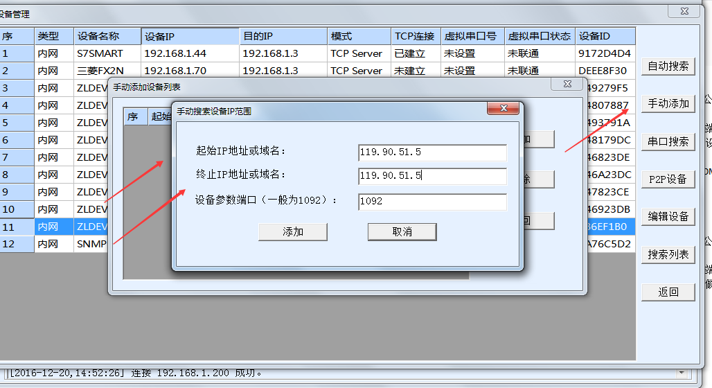 然后在計(jì)算機(jī)的zlvircom軟件上手動(dòng)添加外網(wǎng)設(shè)備,起始IP以及終止IP均設(shè)置為設(shè)備那邊的外網(wǎng)端口,參數(shù)端口為1092。