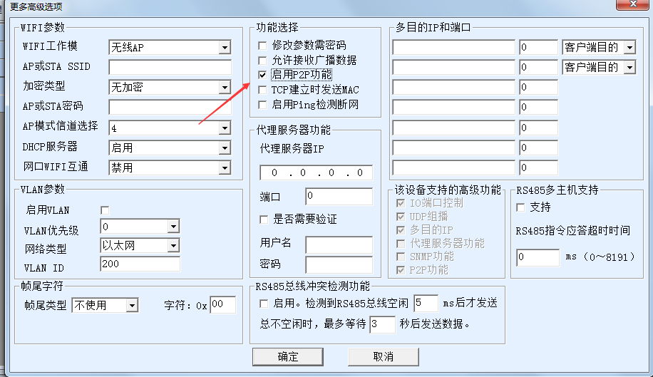 P2P模式下設(shè)備作為TCP服務(wù)器模式,通訊軟件只有使用TCP客戶端或者COM口通訊才可以使用此功能。