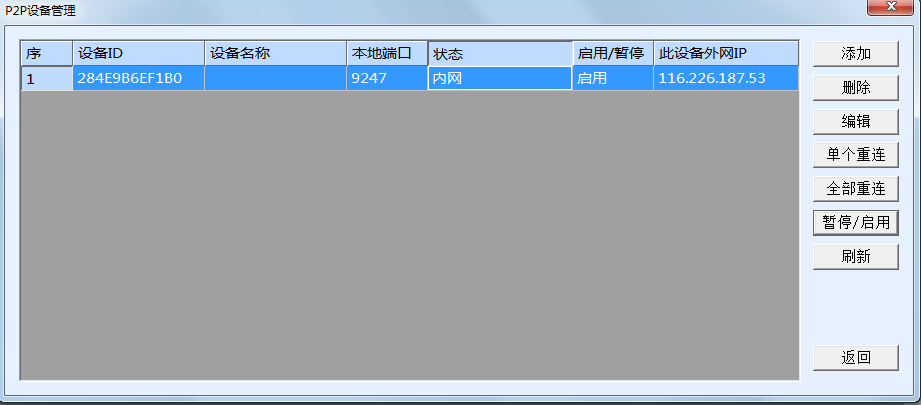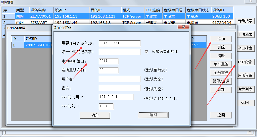 在設(shè)備管理界面點(diǎn)擊P2P功能,添加P2P設(shè)備,將復(fù)制的ID填寫到需要連接的設(shè)備ID處。以及P2P設(shè)備在計(jì)算機(jī)本地模擬的TCP端口。默認(rèn)無密碼。