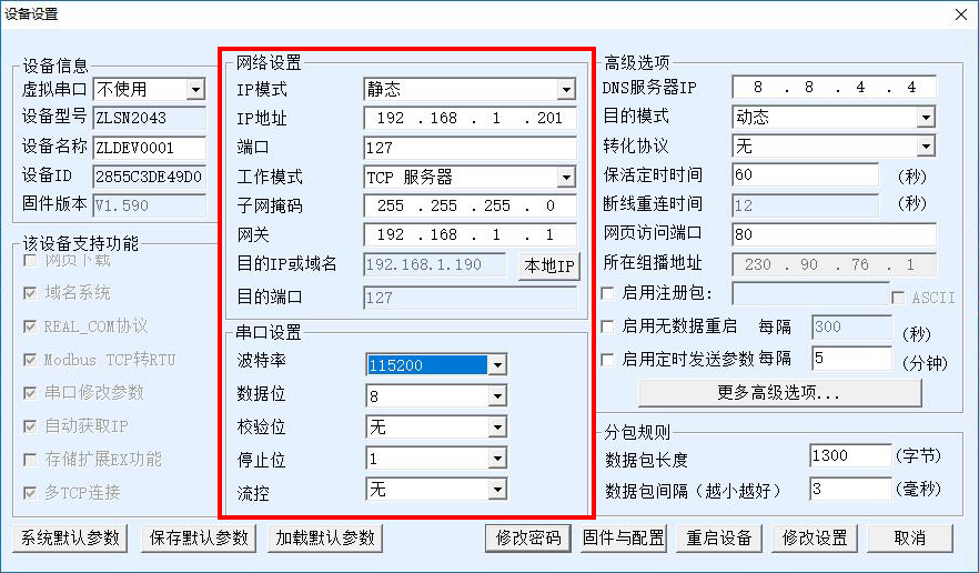 2.如果是以網(wǎng)絡(luò)TCP/IP UDP直接和設(shè)備通信的,即為直接socket通信方式,那么在卓嵐的設(shè)備管理軟件中去設(shè)置設(shè)備工作模式 設(shè)置IP 串口參數(shù)等即可通訊
