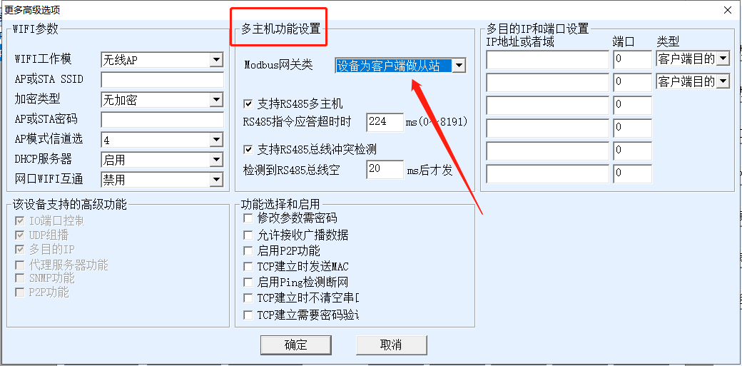 2.點擊更多高級選項-->在多主機設(shè)置中,把存儲型網(wǎng)關(guān)改成設(shè)備為客戶端做從站(串口服務(wù)器擬定網(wǎng)口風(fēng)機從站地址為風(fēng)機IP地址的最后一位,此刻風(fēng)機IP是192.168.1.50.風(fēng)機從站地址就是50)。