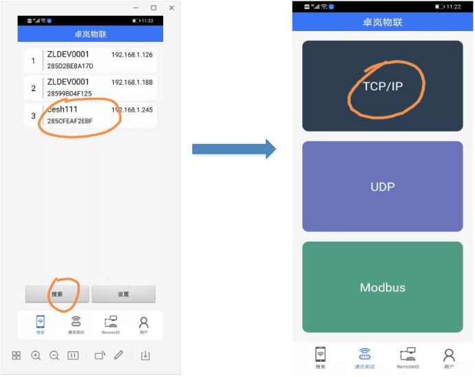 1.打開卓嵐APP軟件,首先手機(jī)通過WiFi鏈接路由器熱點(diǎn)(必須要鏈接和5144J接入的同一個(gè)路由器的熱點(diǎn)),WiFi鏈接上之后,點(diǎn)擊搜索就可以搜到設(shè)備,選擇通訊測試,可以測試通訊。如下圖5。