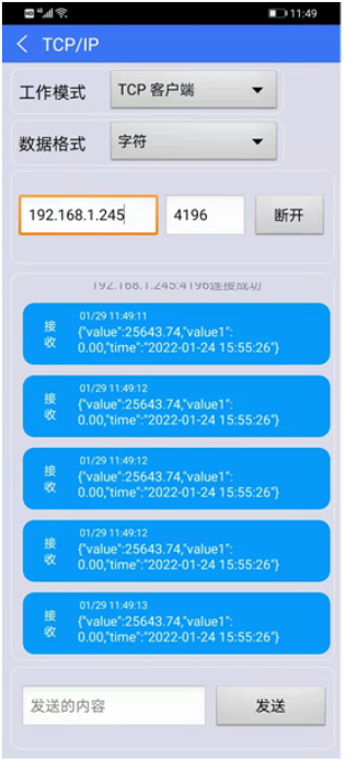 2.選擇通訊測試-->TCP/IP-->工作模式選擇客戶端模式-->iP和端口填寫串口服務(wù)器IP和端口,點(diǎn)擊打開,就讀到數(shù)據(jù)了,如下圖。