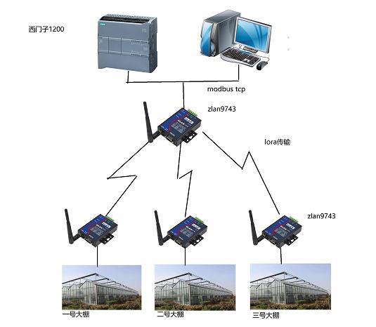 1.大棚端將lora網(wǎng)關(guān)通過485雙絞線和大棚內(nèi)的485串口儀表,采集器和風(fēng)機等設(shè)備手拉手連接。