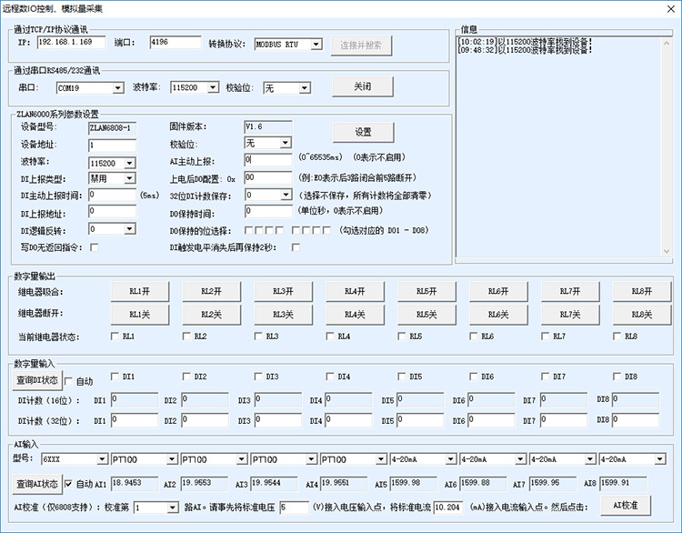 ZLAN6808具有8路模擬量采集,可以同時采集8個PT100/PT1000溫度傳感器,PT100的溫度采集范圍默認是0~300度,PT1000溫度采集范圍是-10~300度,也可以定制各類型溫度范圍,滿足客戶需求。具有16位精度,誤差在0.1度內。設置簡單,使用方便。另外含有8路DO繼電器開關以及8路DI開關量采集,非常適合在工控環(huán)境下使用,有極高的性價比。如果客戶還有RS485設備,可以同時當作串口服務器使用,進行RS485轉以太網(wǎng)/WiFi/4G的功能。另外設備硬件內置硬件看門狗,保證設備24小時不宕機,穩(wěn)定運行。