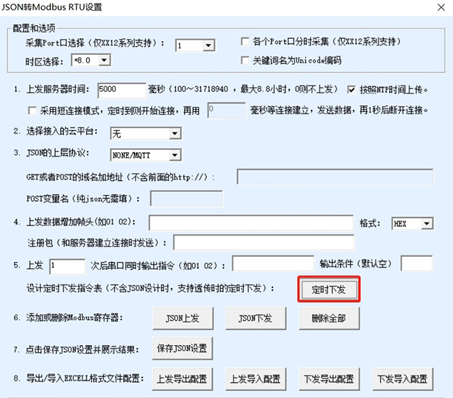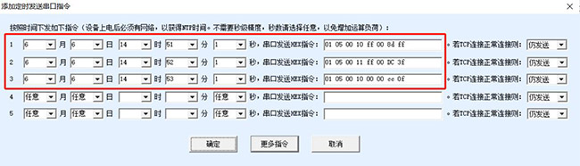 就可以在定時(shí)下發(fā)中,設(shè)置對(duì)應(yīng)的時(shí)間以及需要下發(fā)控制DO的指令,本案例設(shè)置了3條通斷指令,(對(duì)應(yīng)的DO通斷指令可以詳細(xì)查看6808-3說明書,如果修改了站地址指令對(duì)應(yīng)更改即可)