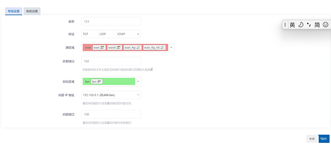點擊新增 名稱隨意設置 123 協(xié)議三個全選 外部端口是apn卡分配的102 目標區(qū)域是網(wǎng)線接的電腦 就是lan口 內(nèi)部ip是可以自動識別到的 內(nèi)部端口