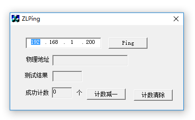 在ZLPing界面的IP地址部分,填入嵌入式網(wǎng)卡的IP地址,然后點擊Ping按鈕,默認(rèn)是192.168.1.200的IP。點擊Ping按鈕有3個作用,(1)獲取嵌入式網(wǎng)卡的物理地址。(2)對嵌入式網(wǎng)卡進行icmp echo(也就是俗稱的ping) 測試,如果測試通過則在“成功計數(shù)”中增一(3)清空本地物理地址緩存。