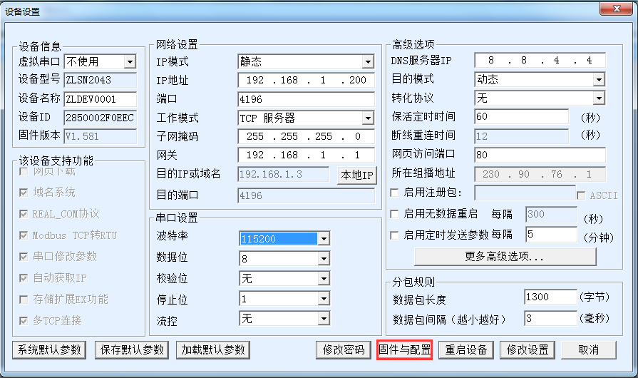 1.首先需要確認設(shè)備的固件版本在1.581及其以上版本(對于2043),使用ZLVircom5.18搜索到設(shè)備后,進入設(shè)備編輯,點擊“固件和配置”按鈕