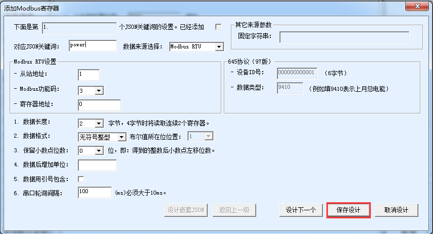 4.這里輸入這個JSON的關(guān)鍵詞為power,并且選擇它的Modbus地址的站地址、功能碼、寄存器地址,以及采集的數(shù)據(jù)的數(shù)據(jù)類型和小數(shù)點。這樣采集的這個Modbus寄存器內(nèi)容將會寫到power的后面,類似{“power”:”100”}。