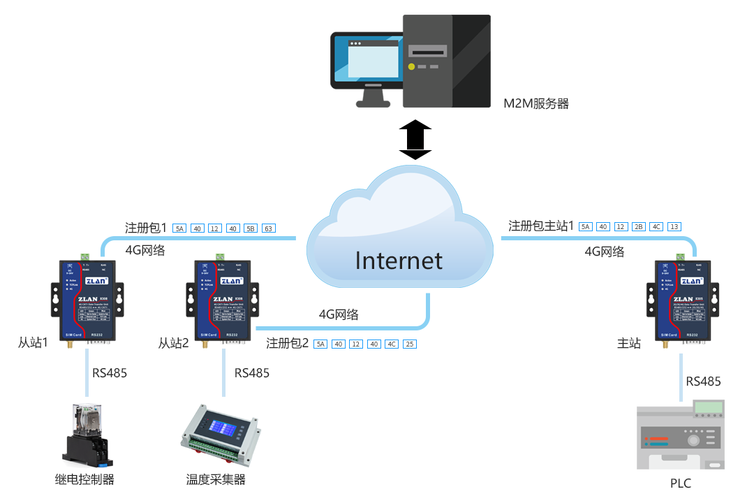 如圖,PLC主站原來(lái)通過(guò)RS485 總線和繼電器控制器和溫度采集器連接。現(xiàn)在通過(guò)3個(gè)4G DTU,然后借助M2M 的服務(wù)器,轉(zhuǎn)發(fā)所需的控制命令,實(shí)現(xiàn)通過(guò)Internet的連接。使用時(shí)首先在M2M服務(wù)器中登記主站的注冊(cè)包“注冊(cè)包主站1”,以及兩個(gè)從站的注冊(cè)包“注冊(cè)包1”和“注冊(cè)包2”,當(dāng)設(shè)備和M2M服務(wù)器建立TCP連接后,立即發(fā)送相應(yīng)注冊(cè)包。 M2M 服務(wù)器識(shí)別了設(shè)備身份后可以進(jìn)行相應(yīng)的數(shù)據(jù)轉(zhuǎn)發(fā)功能??梢詫?shí)現(xiàn)一個(gè)主站多個(gè)從站的數(shù)據(jù)轉(zhuǎn)發(fā)功能。