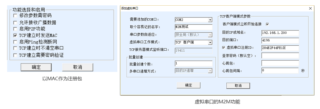 對(duì)于4G DTU一般使用注冊(cè)包,如果是ZLAN5103等串口服務(wù)器,可以使用連接上發(fā)送MAC 地址功能更方便,如圖所示。另外也可以通過(guò)M2M功能實(shí)現(xiàn)計(jì)算機(jī)的虛擬串口和卓嵐設(shè)備的連接,即在虛擬串口作為TCP客戶端的情況下設(shè)置一個(gè)注冊(cè)包。