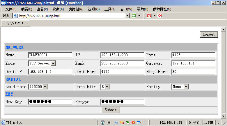 串口服務器核心模塊內部運行了一個小型的Web服務器可以用于參數(shù)的配置,使用過路由器配置的用戶對此方法一定不陌生。首先在瀏覽器的地址欄中輸入串口服務器模塊的當前IP地址,默認出廠IP為192.168.1.200。此時打開的頁面即是串口服務器模塊上的登錄頁面,輸入登錄密碼(默認為123456)點擊Login,進入?yún)?shù)配置頁面。如圖所示。修改相應參數(shù)后點擊“Sbumit”按鈕即可提交參數(shù)。