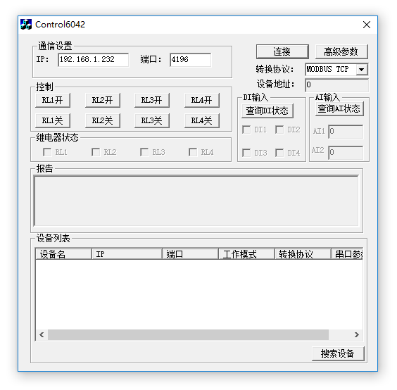 卓嵐為ZLAN6042、ZLAN6032遠(yuǎn)程IO控制器開(kāi)發(fā)了網(wǎng)絡(luò)遠(yuǎn)程IO控制軟件Control6042。該軟件有2個(gè)版本,一個(gè)是運(yùn)行于windows計(jì)算機(jī)平臺(tái)的Cotrol6042軟件,另外一個(gè)是運(yùn)行于Andrio手機(jī)平臺(tái)的RemoteIO軟件。