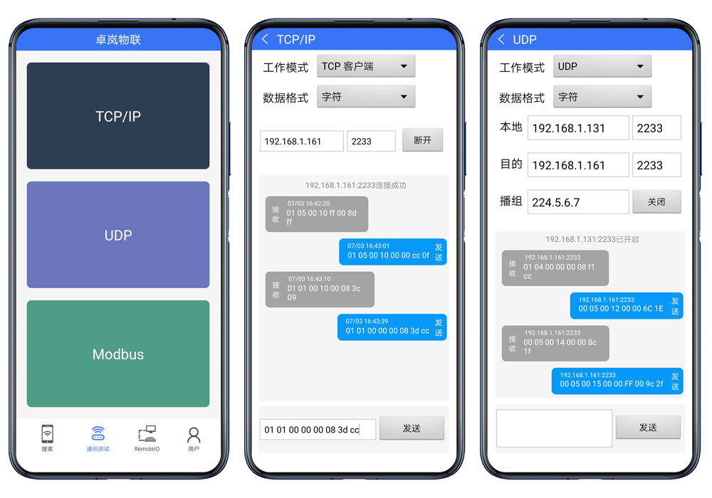網(wǎng)絡(luò)調(diào)試助手apk卓嵐物聯(lián)是一款手機(jī)網(wǎng)絡(luò)調(diào)試助手 手機(jī)tcp調(diào)試工具 它是用于手機(jī)端或平板上的網(wǎng)絡(luò)TCP/UDP通信調(diào)試工具,該工具全面集成 TCP服務(wù)器/客戶端; UDP服務(wù)器/客戶端; UDP廣播/組播功能,數(shù)據(jù)支持16進(jìn)制的發(fā)送和16進(jìn)制接收顯示,支持字符以及文本發(fā)送,聊天框的界面數(shù)據(jù)交互形式,數(shù)據(jù)交互一目了然,可廣泛用于GPRS/CDMA/局域網(wǎng)/廣域網(wǎng)等基于Socket方式的數(shù)據(jù)采集平臺的通信調(diào)試,它可以幫助網(wǎng)絡(luò)編程人員、網(wǎng)絡(luò)維護(hù)人員檢查所開發(fā)的網(wǎng)絡(luò)應(yīng)用軟硬件的通信狀況。網(wǎng)絡(luò)調(diào)試助手apk卓嵐物聯(lián)網(wǎng)將成為您的手機(jī)端TCP/UDP Socket測試的得力助手。