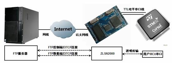 ZLSN2000串口轉(zhuǎn)RJ45模塊將FTP服務(wù)器上獲取的文件內(nèi)容從串口輸出給用戶使用。如果是上傳數(shù)據(jù),用戶將FTP文件的內(nèi)容從串口發(fā)給ZLSN2000。