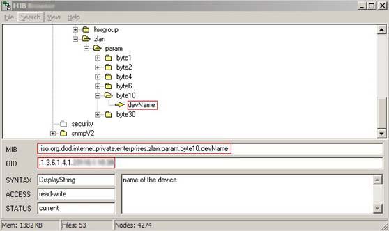ZLAN_MIB存在于.iso.org.dod.internet.private.enterprises下,會在這個節(jié)點(diǎn)下面增加zlan節(jié)點(diǎn),并在zlan下產(chǎn)生param節(jié)點(diǎn)。之下的每個節(jié)點(diǎn)參數(shù)都有自己的OID序號。