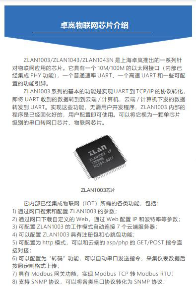 ZLAN1003是上海卓嵐推出的一款針對物聯(lián)網(wǎng)應用的芯片。它具有一個10M/100M的以太網(wǎng)接口(內(nèi)部已經(jīng)集成PHY功能),一個普通速率UART、一個高速UART和一些可配置的功能引腳。