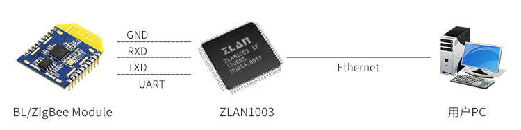 (1) 對接無線串口模塊:ZLAN1003可以用作某些無線模塊數(shù)據(jù)采集轉(zhuǎn)化為TCP/IP的網(wǎng)關。這個網(wǎng)關一端是無線模塊,比如藍牙、Zigbee、Rola等UART接口的模塊,另外一端是以太網(wǎng)。此時只需要將ZLAN1003的UART和無線模塊的UART直接對接即可,不需要再增加一個MCU。