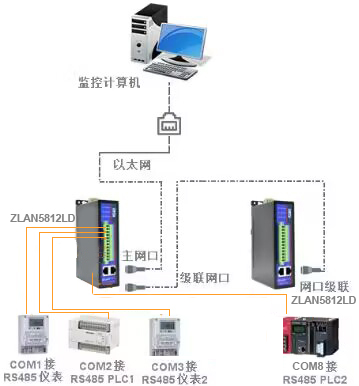 ZLAN5412D可以實現(xiàn)4路TCP/IP協(xié)議到RS485的轉(zhuǎn)化,4路同時工作且可以配置為不同的波特率。可實現(xiàn)通過網(wǎng)絡(luò)對485設(shè)備進行數(shù)據(jù)采集,網(wǎng)絡(luò)端可以使用虛擬串口連接串口軟件或者直接TCP/IP通訊的軟件。ZLAN5412D自帶兩個10M/100M網(wǎng)口,可以任意接一個網(wǎng)口。另外的一個網(wǎng)口可以通過網(wǎng)線實現(xiàn)多個ZLAN5412D的級聯(lián),可以級聯(lián)為8串口、16串口。