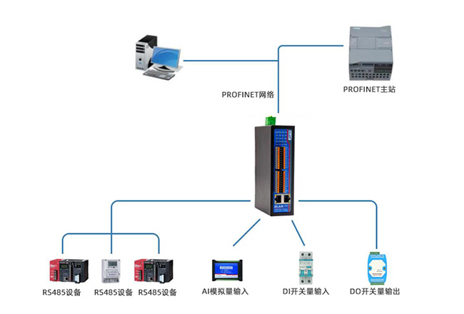 如下圖所示的典型應(yīng)用中,借助ZLAN6813網(wǎng)關(guān),能夠便捷采集各類傳感器的開關(guān)量與模擬量信號。Profinet主站可經(jīng)此網(wǎng)關(guān)直接讀取上述采集數(shù)據(jù);與此同時,Profinet主站還能通過ZLAN6813網(wǎng)關(guān)輸出開關(guān)量信號。額外的一路串口支持Profinet主站讀取遵循Modbus RTU協(xié)議的RS485串口設(shè)備數(shù)據(jù),實現(xiàn)不同協(xié)議設(shè)備間高效的數(shù)據(jù)交互與協(xié)同運(yùn)作。