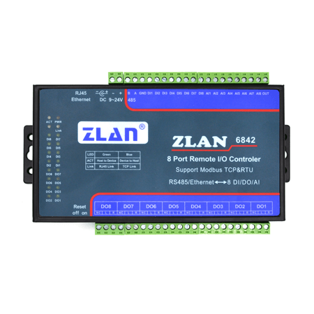 ZLAN6842:這是一款使用以太網(wǎng)進(jìn)行控制的IO控制器,通常采用的通信協(xié)議為Modbus TCP協(xié)議,此時模塊的轉(zhuǎn)化協(xié)議選擇為Modbus TCP轉(zhuǎn)RTU,DI、DO、AI分別對應(yīng)不同的寄存器。如果希望通過Modbus RTU協(xié)議進(jìn)行控制也是可以的,此時將模塊的轉(zhuǎn)化協(xié)議設(shè)置為“無”,通過TCP發(fā)送Modbus RTU協(xié)議即可進(jìn)行控制。該款產(chǎn)品可以方便、可靠的通過以太網(wǎng)對開關(guān)量進(jìn)行采集、對繼電器進(jìn)行控制、對傳感器進(jìn)行采集。