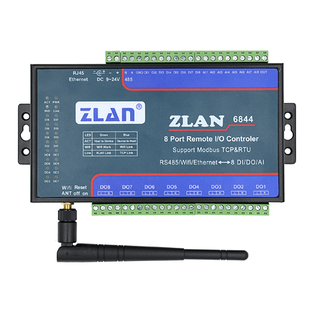 ZLAN6842、ZLAN6802、ZLAN6844是繼ZLAN6042之后上海卓嵐信息科技有限公司推出的8路遠程IO控制器。其控制的路數(shù)從6042 的4路擴展到8路,含有8路DI、8路DO,8路AI輸入。其中DI支持干節(jié)點和濕節(jié)點,帶光耦隔離;DO為繼電器輸出,具有5A 250VAC或5A 30VDC的控制能力;AI輸入中的前4路支持0~5V電壓量輸入,后4路支持4~20mA電流量輸入,精度10位。ZLAN6842、ZLAN6802、ZLAN6844分別支持以太網、RS485、Wifi這3種形式的通信方式。