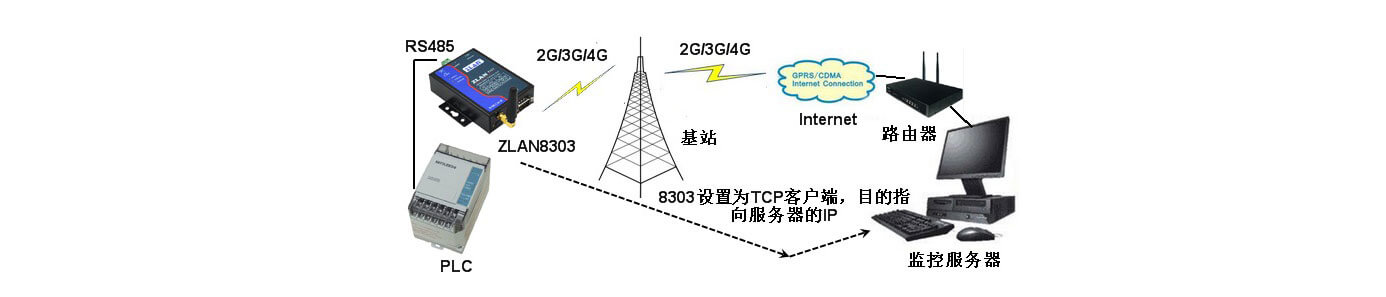 普通3G/4G DTU可以作為T(mén)CP Server方式被其它網(wǎng)絡(luò)設(shè)備連接,由于3G/4G模式下8303的IP不固定,所以一般不會(huì)用作TCP Server方式,更多的情況是它作為T(mén)CP Client連接到一個(gè)固定IP(或者域名)的服務(wù)器,并發(fā)送自己采集的數(shù)據(jù)。服務(wù)器上的軟件通過(guò)輪訓(xùn)的方式可以索要數(shù)據(jù)。8303的RS485/RS232可以連接需要采集的串口設(shè)備、PLC,將論需的指令下發(fā)給PLC,并將返回的數(shù)據(jù)上傳服務(wù)器。如圖1所示。