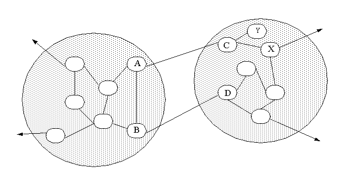 Assume that two autonomous networks are connected to each other at two locations, as shown in Figure 5.3, with connections to different autonomous networks at other locations. The AC connection and the BD connection can both be used for routing from within the networks, depending on which is the optimal path. Gateway C has a copy of gateway A's routing table, and vice versa. Gateways B and D each have copies of the other's routing tables, as well. These copies are transmitted at intervals so the gateways can maintain an up-to-date picture of the connections available through the other gateway. The gateways use EGP to send the messages. (They would use GGP if they were core gateways.)