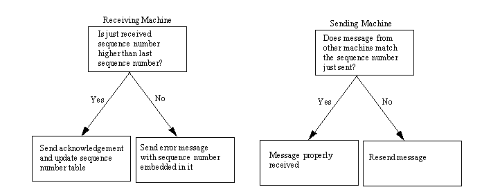 The sending gateway sends packets with an incrementing sequence number. The destination gateway receives each packet and echoes back the sequence number in a message. If the destination gateway receives the next packet with a sequence number that does not follow the one last received, an error message is returned to the sender with the sequence number of the last packet in it. If the sequence number is correct, an acknowledgment is sent. As the sending gateway receives packets back from the destination, it compares the sequence number in the packet to its own internal counter. If the sequence number in the destination machine's packet does not match, the packet that would have been next in sequence from the last correctly received packet is resent.