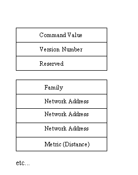 The format of the RIP messages is shown in Figure 5.11. The message header is composed of three fields for the command (set to 1 if a request and 2 if a response), the version number of the RIP protocol, and an unused reserved field. The rest of the message contains address information. Each set begins with an identifier of the family protocol used (RIP is not specifically for the Internet's protocols, but if used on the Internet this value is set to 2) and a set of network IDs. There are 96 bits available for the network address, of which only a maximum of 32 are necessary for an Internet address. The last field is a metric value that usually identifies the number of hops to the network.