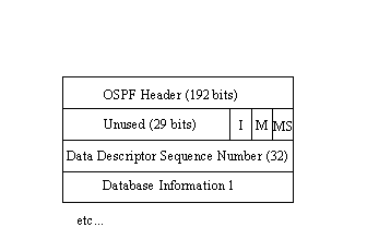 The format of the database description packet is shown in Figure 5.16. After the OSPF header is a set of unused bits, followed by three 1-bit flags. When the I (initial) bit is set to 0, it indicates that this packet is the first in a series of packets. The M (more) bit, when set to 1, means that more database description packets follow this one. The MS (master/slave) bit indicates the master/slave relationship. When it has a value of 1 it means that the router that sent the packet is the master. A 0 indicates that the sending machine is the slave. The Data Descriptor Sequence Number is an incrementing counter. The rest of the packet contains Link State advertisements as seen in Figure 5.14.