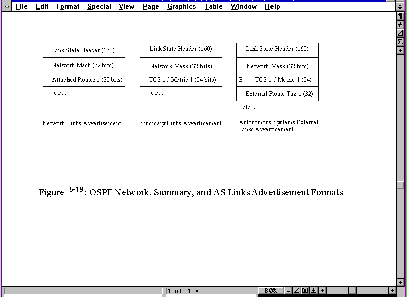 The other three formats available are the Network Links advertisement, Summary Links advertisement, and Autonomous Systems (AS) External Links advertisement. The formats of these advertisements are shown in Figure 5.19. The fields have all been described earlier in this section.